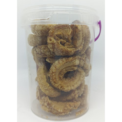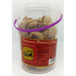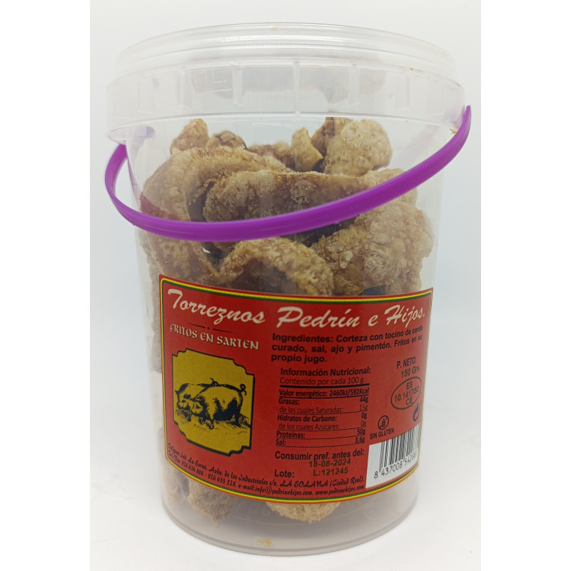 Fritos en sarten, ingredientes: corteza con tocino de cerdo curado, sal, ajo y pimentón. Fritos en su propio jugo.